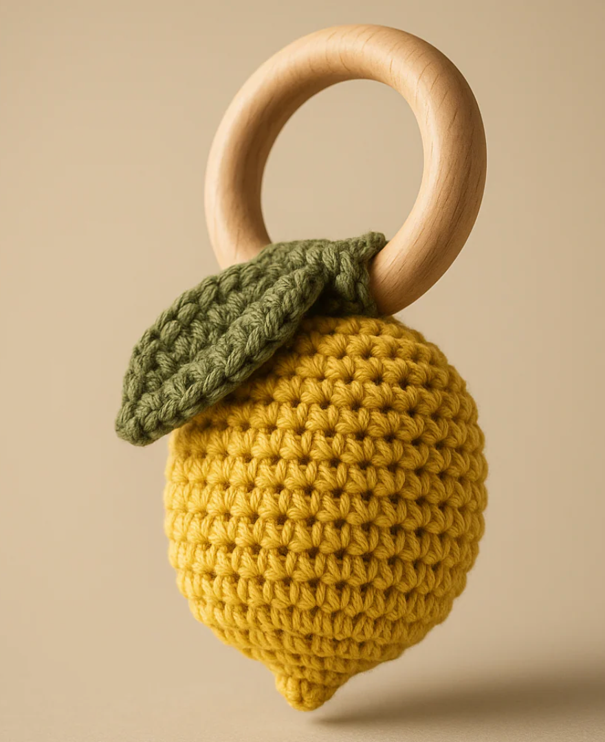 - A hand crocheted lemon rattle with a natural wooden ring for safe play