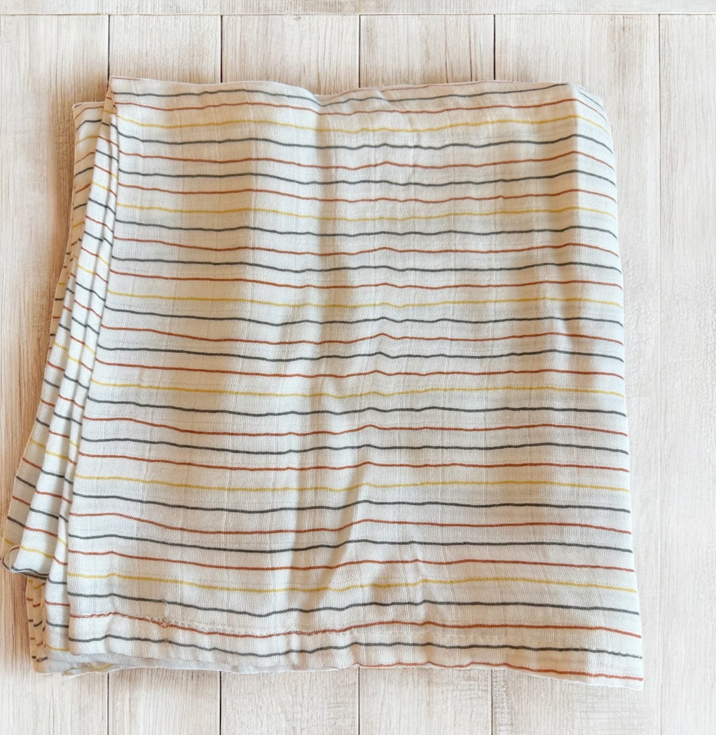 - A striped swaddle blanket with baby’s name